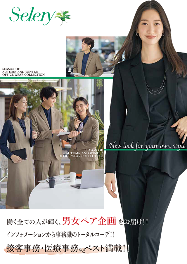 セロリーのオフィスウェアは、洗練されたデザインで職場の統一感と好印象を演出します。