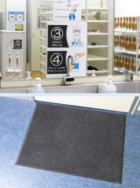 (上)加工エリアに入る前の衛生手順を示す貼り紙。ベトナム人スタッフにも分かりやすいように、ベトナム語とイラストを使っている。 (下)事務所ドア前のマット。用途に合わせてサニクリーンのマットを使い分けている。